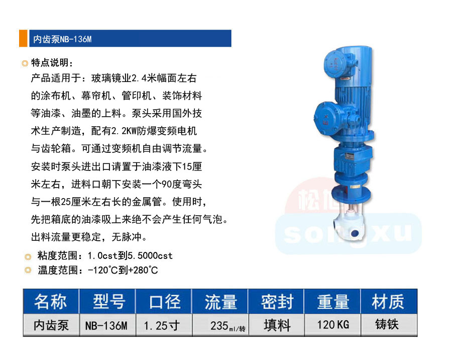 產品適用于:玻璃鏡業2.4米幅面左右的涂布機、幕簾機、管印機、裝飾材料等油漆、油墨的上料。泵頭采用國外技術生產制造,配有2.2KW防爆變頻電機與齒輪箱。可通過變頻機自由調節流量。安裝時泵頭進出口請置于油漆液下15厘米左右,進料口朝下安裝一個90度彎頭與一根25厘米左右長的金屬管。使用時,先把箱底的油漆吸上來絕不會產生任何氣泡。出料流量更穩定,無脈沖。