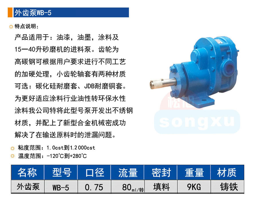 產品適用于:油漆,油墨,涂料及 15一40升砂磨機的進料泵。齒輪為 高碳鋼可根據用戶要求進行不同工藝 的加硬處理,小齒輪軸套有兩種材質 可選:碳化硅耐磨套、JDB耐磨銅套。 為更好適應涂料行業油性轉環保水性 涂料我公司特將此型號泵開發出不繡鋼 材質,并配上了新型合金機械密成功 解決了在輸送原料時的泄漏問題。