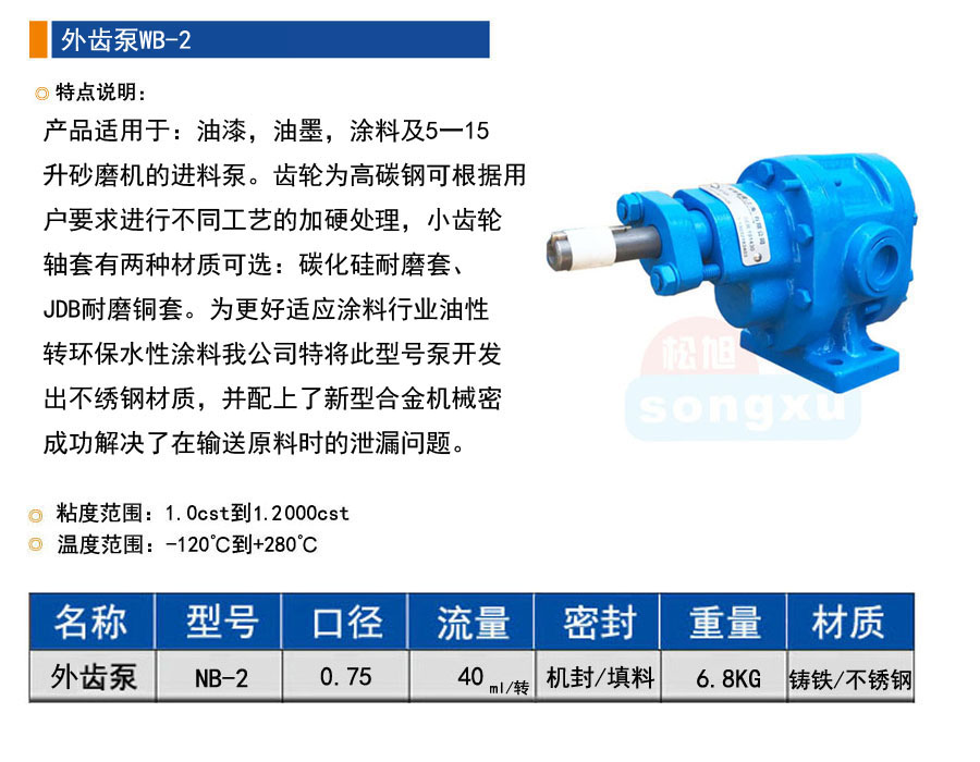 產(chǎn)品適用于:油漆,油墨,涂料及5一15 升砂磨機的進料泵。齒輪為高碳鋼可根據(jù)用 戶要求進行不同工藝的加硬處理,小齒輪 軸套有兩種材質(zhì)可選:碳化硅耐磨套、 JDB耐磨銅套。為更好適應涂料行業(yè)油性 轉(zhuǎn)環(huán)保水性涂料我公司特將此型號泵開發(fā) 出不繡鋼材質(zhì),并配上了新型合金機械密 成功解決了在輸送原料時的泄漏問題。